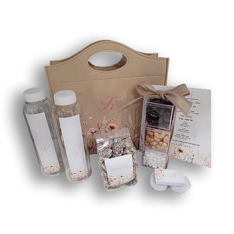 This Felt Tote Bag with a charming wildflower design is the perfect welcome gift to impress your guests. Thoughtfully curated, it includes two personalized water bottles, candles and matches, and three acrylic boxes filled with chocolates, nuts, and mints. The set also features Popinsanity treats and a detailed itinerary, offering both comfort and convenience. Crafted for style and practicality, this welcome bag enhances your hospitality with elegance and thoughtful touches. This bag is also available in white or black. Custom Designs available upon request.