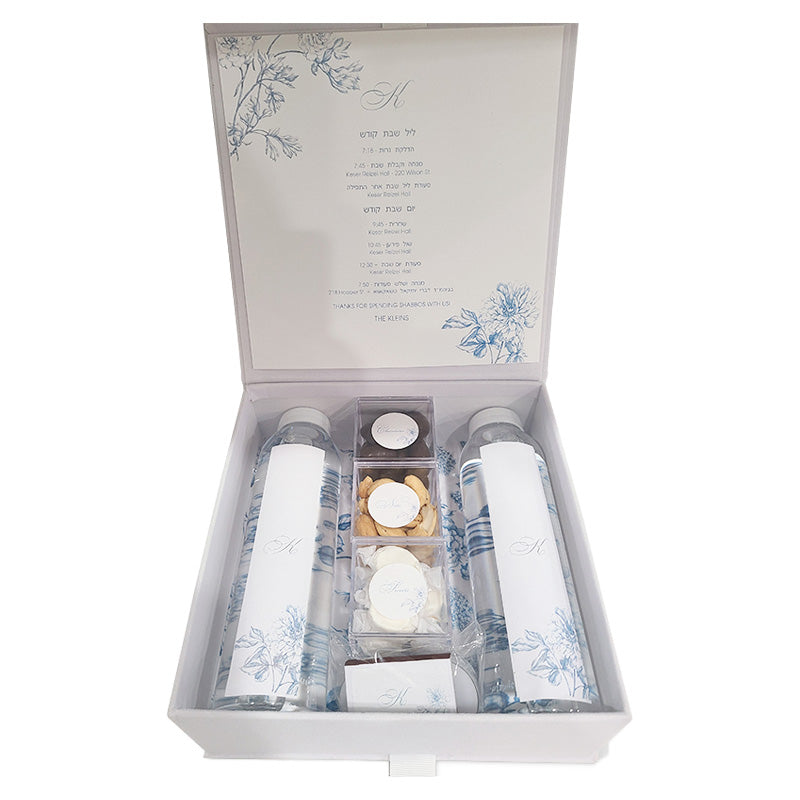 Welcome your guests with elegance and style with our White Velvet French Toile Design Welcome Box. This luxurious white velvet box features a stunning French Toile design and includes two bottles of water, delectable treats in acrylic boxes, candles and matches, and a matching itinerary. Impress your guests with this thoughtful and beautifully curated welcome box. Measures 8.5 x 8.5 inches.